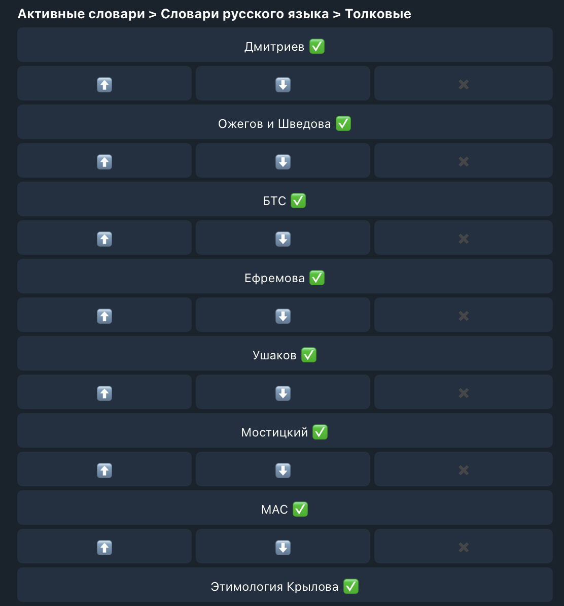Разные словари у вас в телефоне: языковые словари английского, немецкого, русского и других языков; толковые словари Ожегова, Ушакова, Ефремова; языковые словари профильной направленности — медицинские, технические. Бот подскажет значение любого введенного слова, предложит синонимы и перевод. Можно даже получить определение из «Википедии».