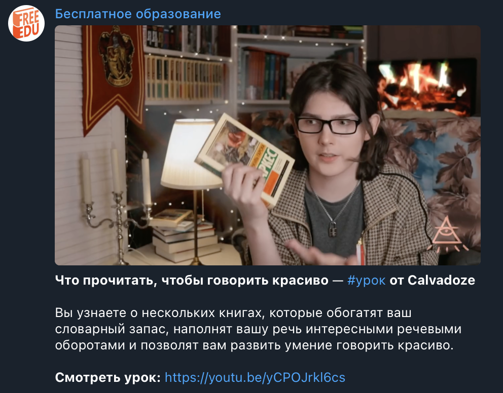 Этот телеграм-канала для любителей учиться. Здесь публикуются анонсы бесплатных лекций, курсов и семинаров, а также полезные видео и интервью с Youtube. Среди тем: как быстро сделать презентацию, запоминать информацию, побороть зависимость от смартфона, освоить формулы в Excel, получить ровную осанку.