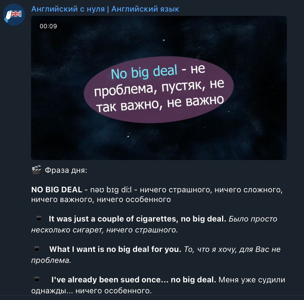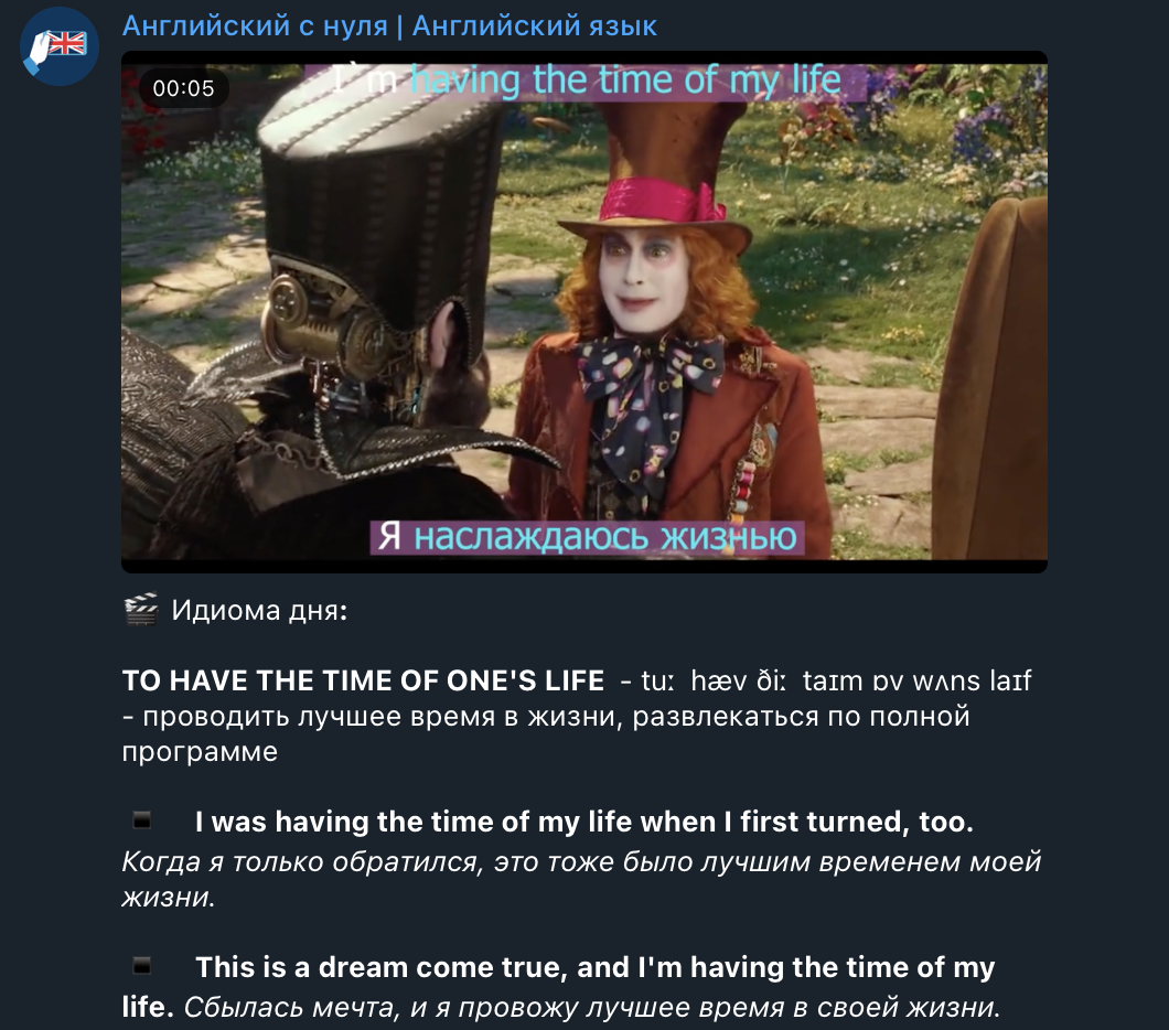 Этот телеграм-канал поможет прокачать английский и пополнить словарный запас. Каждый день здесь публикуются слова и фразы с примерами из фильмов.