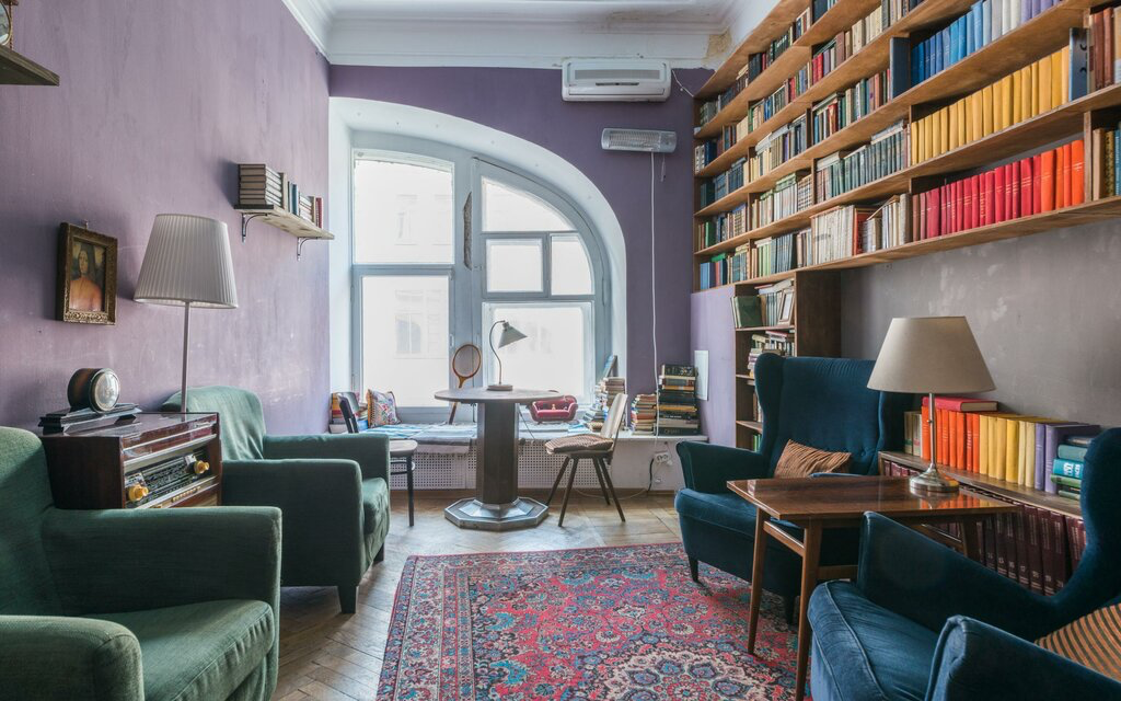 Некрасовка на Бауманской — комфортное пространство для работы и учёбы. Каждый найдёт для себя удобный уголок: здесь и мягкие подоконники и пуфики, и рабочие столы с компьютерами среди книжных полок.
