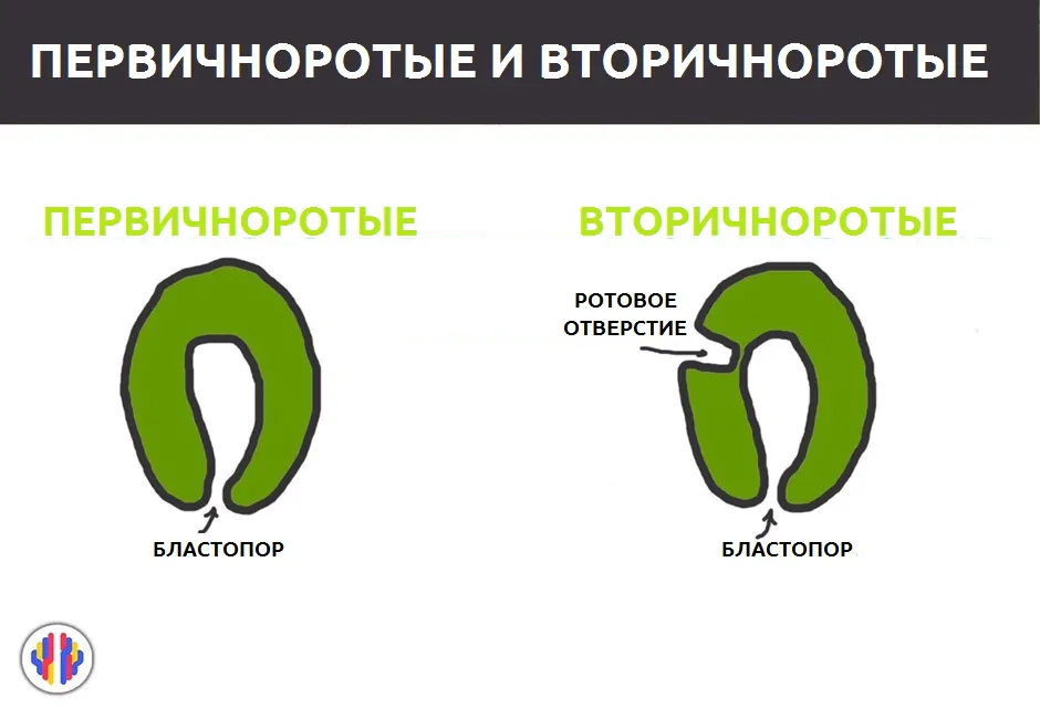 У первичноротых рот формируется из бластопора, а анальное отверстие прорывается с другой стороны. У вторичноротых всё происходит наоборот.