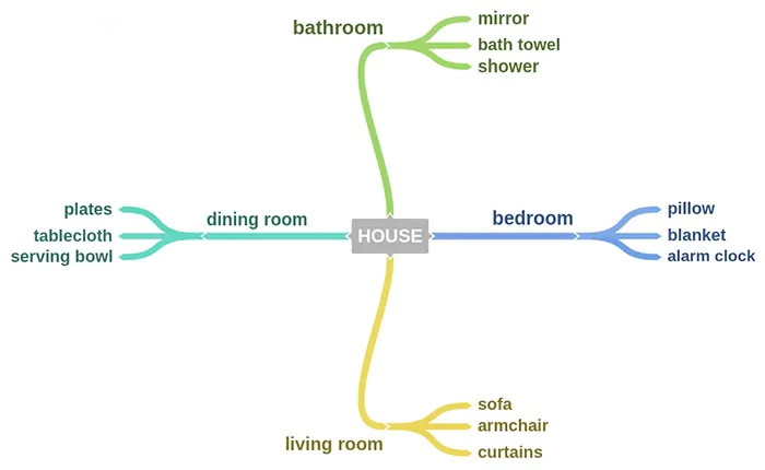 Вы легко выучите английские слова одной тематики, если нарисуете интеллект-карту (a mind map). Такая схема наглядно показывает, к какой теме относятся слова. А пока вы ее рисуете, лексика отложится в памяти. Mind map может выглядеть следующим образом: