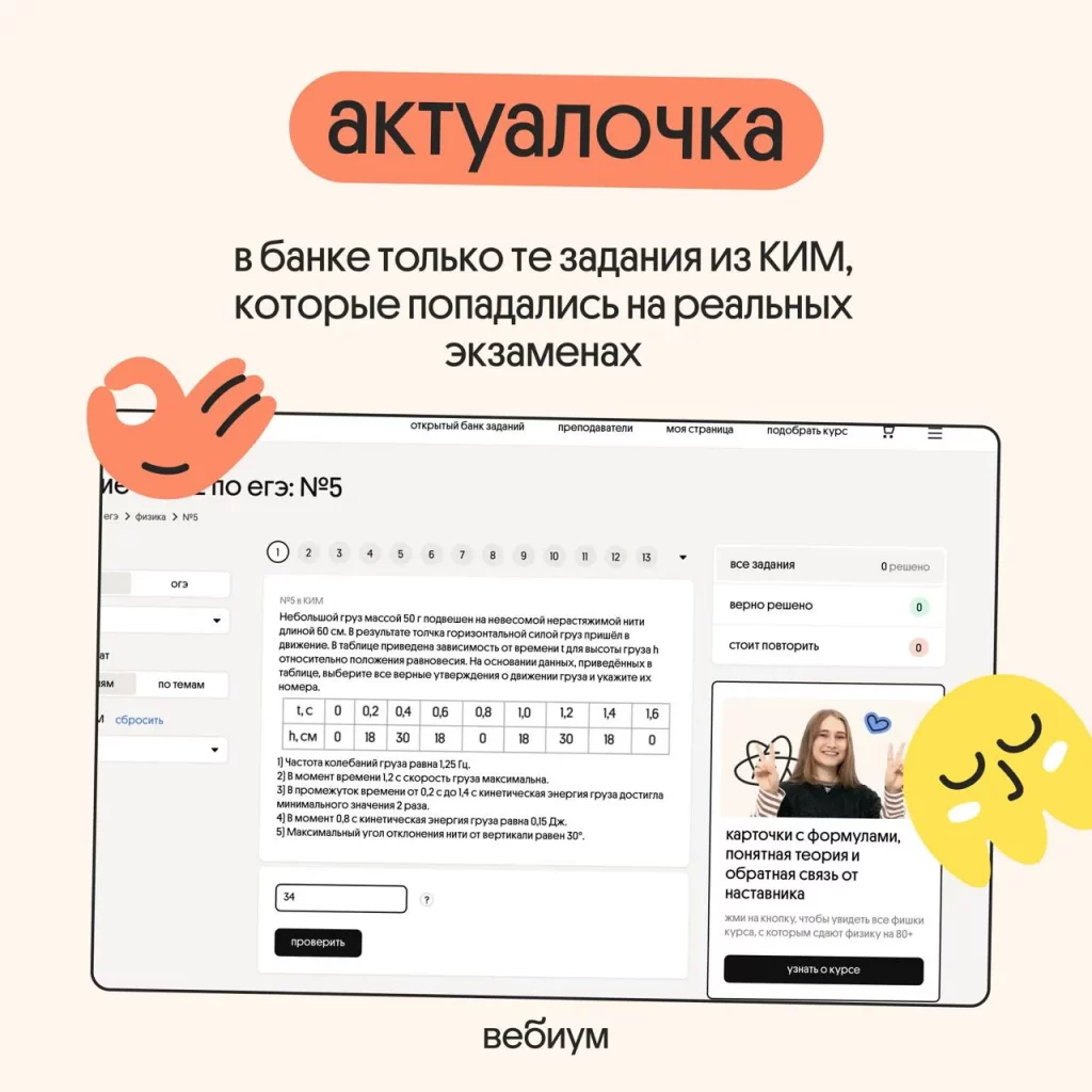 Готовься к ЕГЭ и ОГЭ 2026 бесплатно на реальных заданиях с помощью открытого банка от Вебиума. Сохраняй ответы, пользуйся ключами и пояснениями, фильтруй по темам и уровням, чтобы набрать максимум баллов.