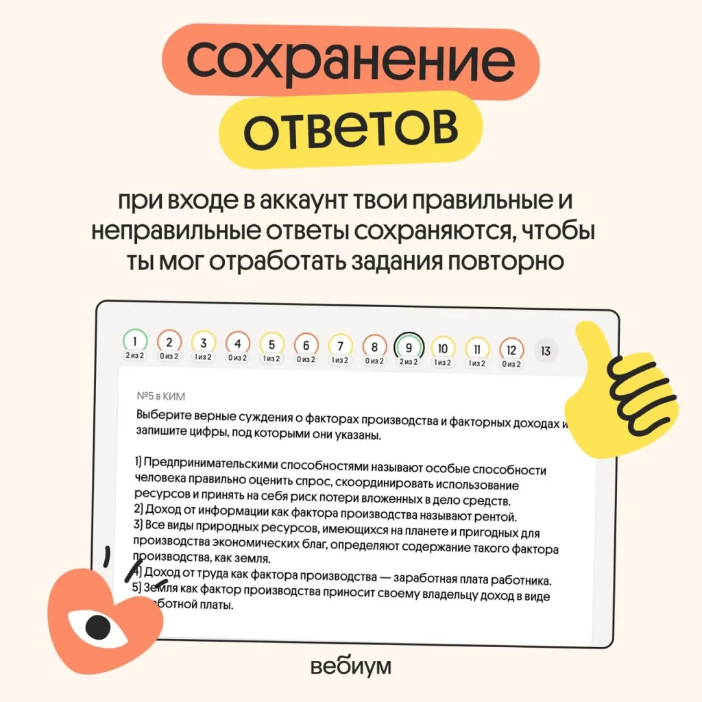 В аккаунте сохраняются все твои ответы, как верные, так и неверные. Повторяй работу над ошибками и отслеживай прогресс.