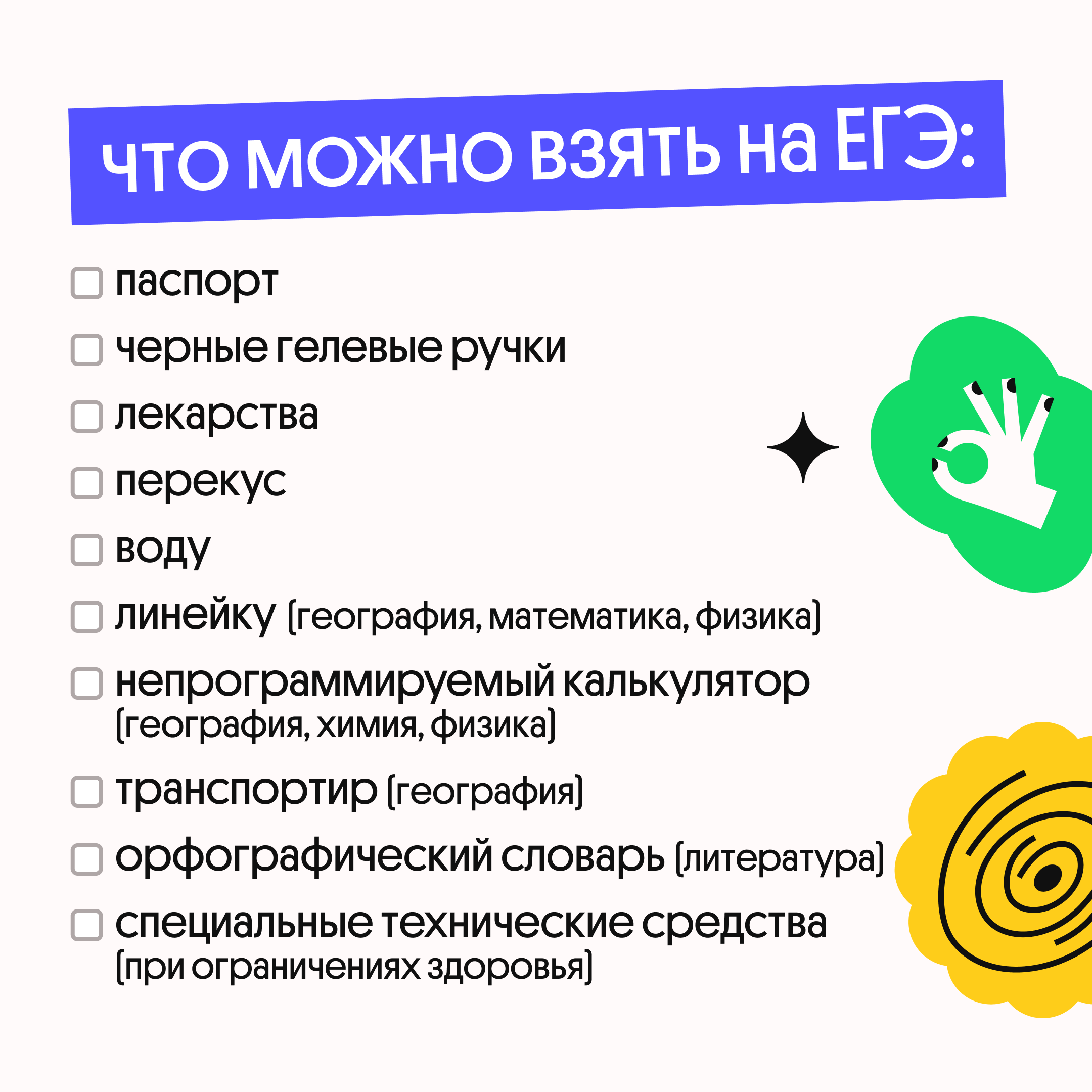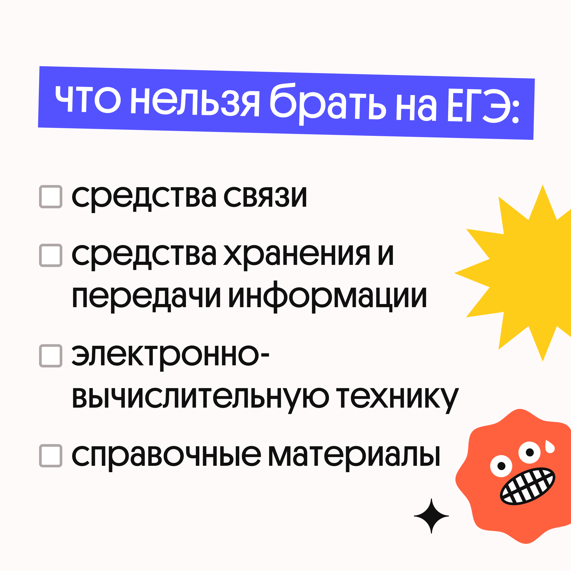 ❗️ Кстати, к этим заумным «средствам хранения и передачи информации» относится бумажка с датами и адресами, которую выдали в школе, — уведомление о регистрации. Потенциально на ней можно что-то написать, поэтому её проносить в школу тоже нельзя. Как и вообще любые бумажки — черновик вам выдадут в аудитории.