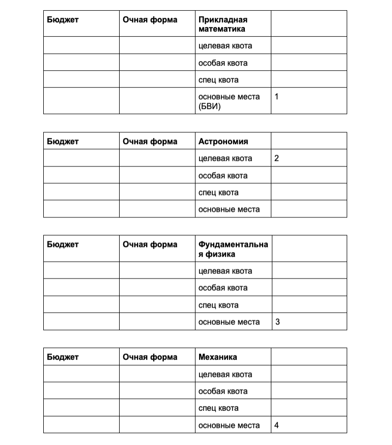 Студент подаёт документы на бюджет на четыре направления: прикладная математика, астрономия, фундаментальная физика и механика.