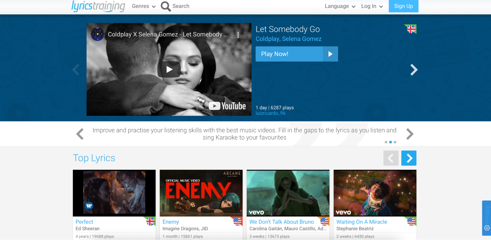 Как это работает: вы смотрите клип/слушаете песню и одновременно заполняете пропуски в Lyrics (слова в песне). Можно выбрать жанр, тематику и исполнителей, поэтому можно слушать любимые песни и учить английский.