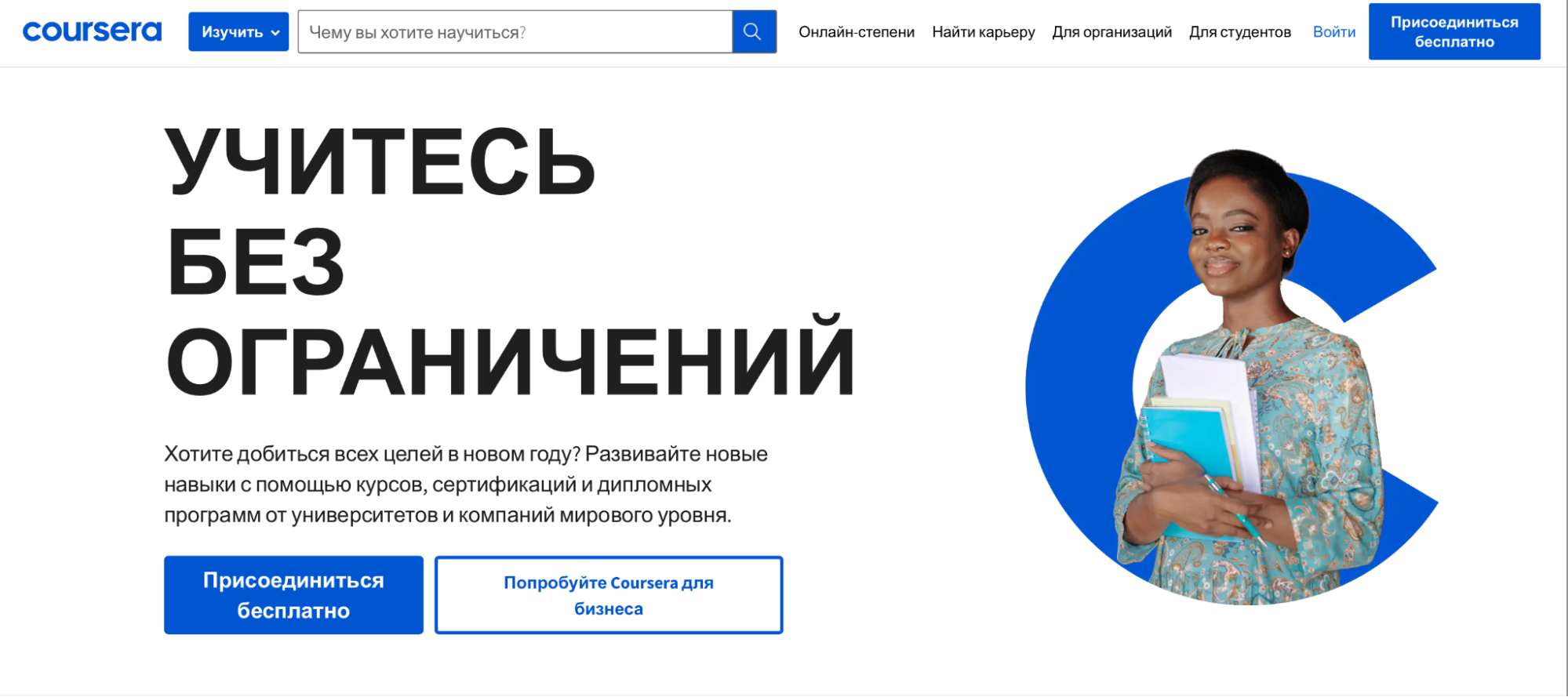 Если уровень языка позволяет, попробуйте учиться на английском. Например, запишитесь на курсы на платформе Coursera. Там есть как и бесплатные дисциплины, так и платные. Выбор большой: и курсы по психологии, и по бизнесу, и по искусству, и по медицине, есть также курсы по информатике, обществознанию и истории.