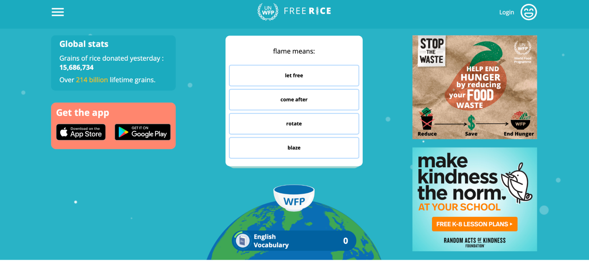 Как это работает: Ресурс для запоминания синонимов. За каждый правильный ответ «Всемирная продовольственная программа Организации Объединенных Наций» жертвует десять зерён риса малоимущим людям.