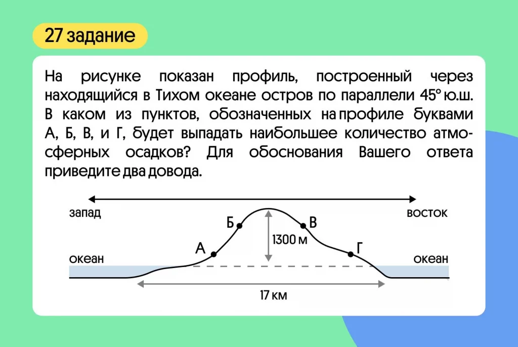 🔜 Обратите внимание, что есть пример задания с муссонами. Они преобладают у восточного побережья Евразии и Северной Америки*. И если в условии задания будет указано на такое географическое положение, то нужно понимать что основные осадки муссоны приносят летом с океана (то есть с востока), поэтому восточный склон будет наветренным.