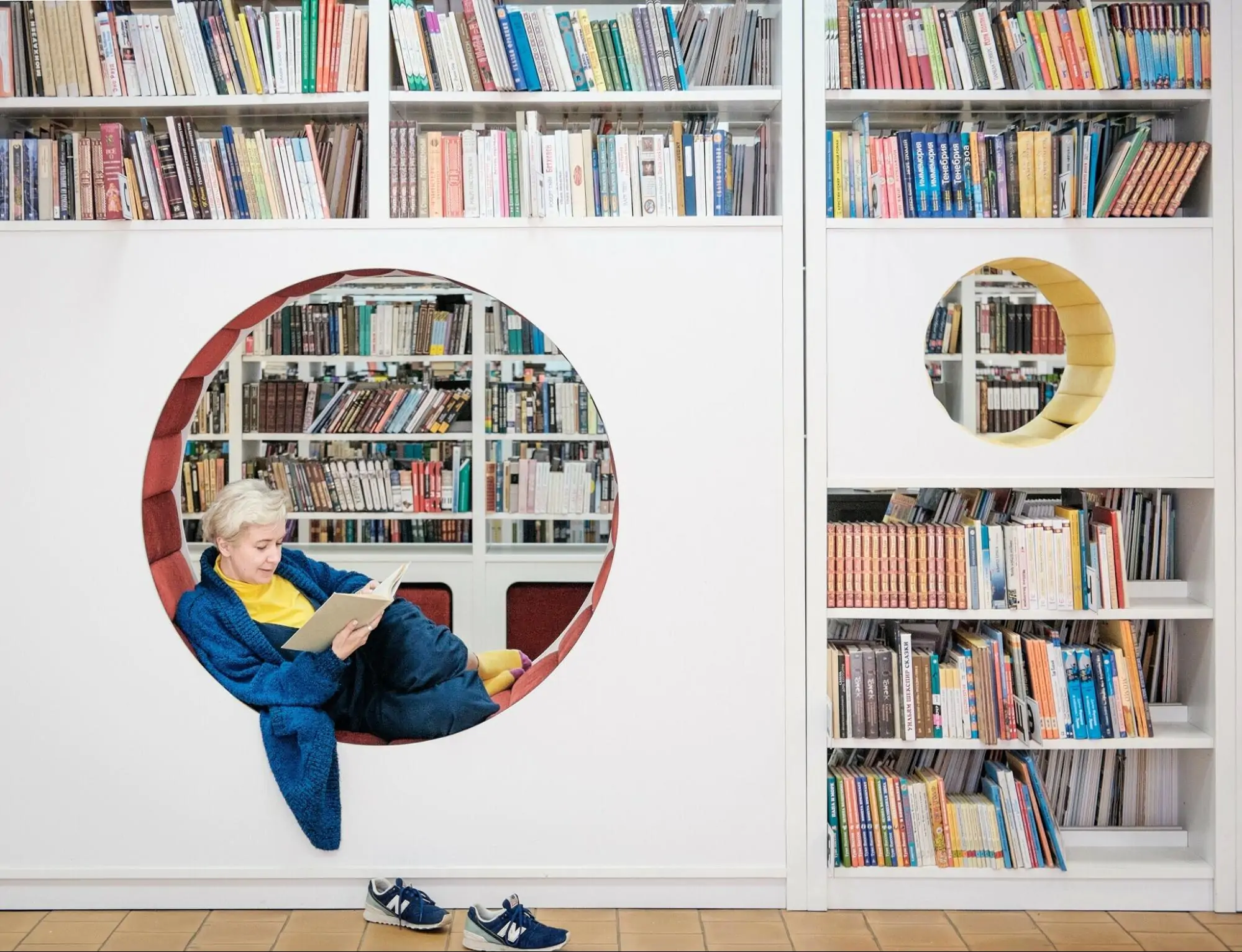 В библиотеке царит тишина, есть большие окна, поэтому внутри всегда много света. Также здесь есть удобные стулья, кресла, столы и пуфики. Можно даже сидеть прямо в стеллажах с книгами или на мягких подоконниках.