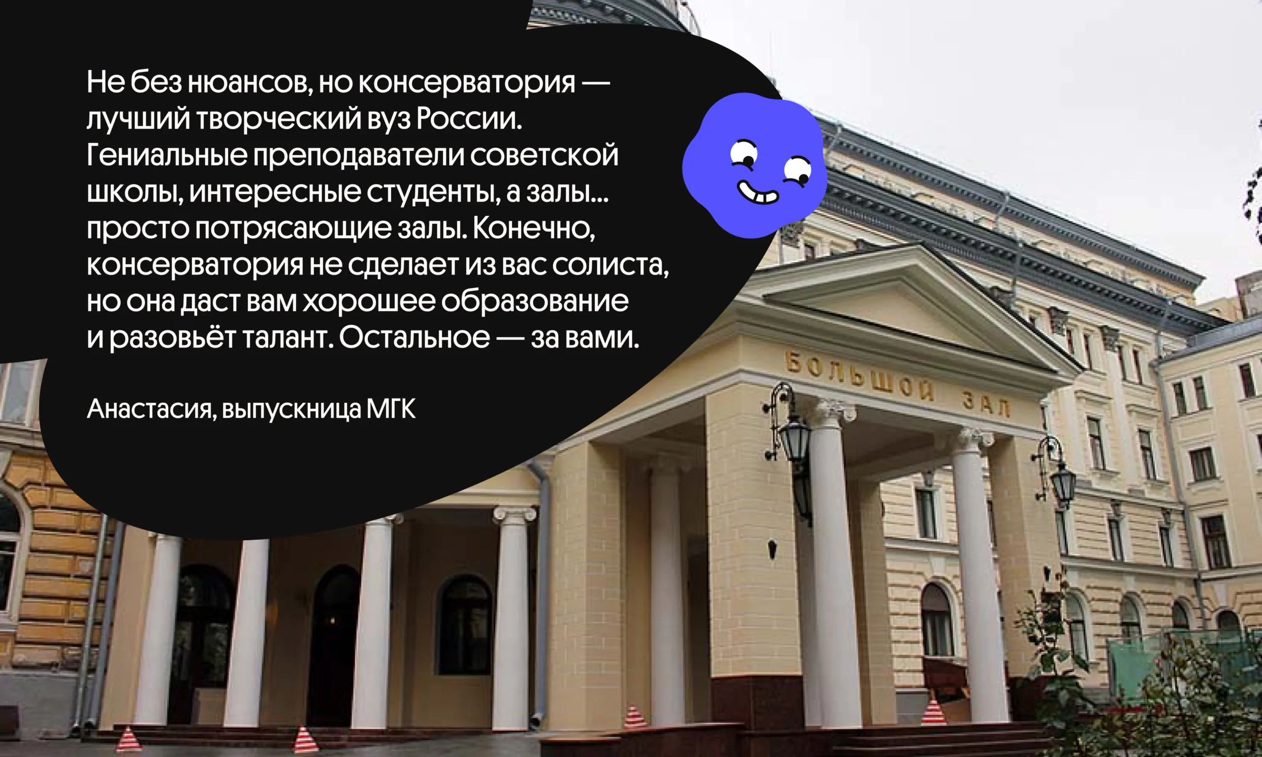 МГК им. П.И. Чайковского — это не только лучший творческий вуз России, но и крупный научный центр в музыкальной сфере. Поступить сюда действительно сложно из-за серьёзного творческого конкурса, которого точно нет даже у страдальцев-технарей. Ещё сложнее — остаться здесь, постигая азы классического советского музыкального образования.