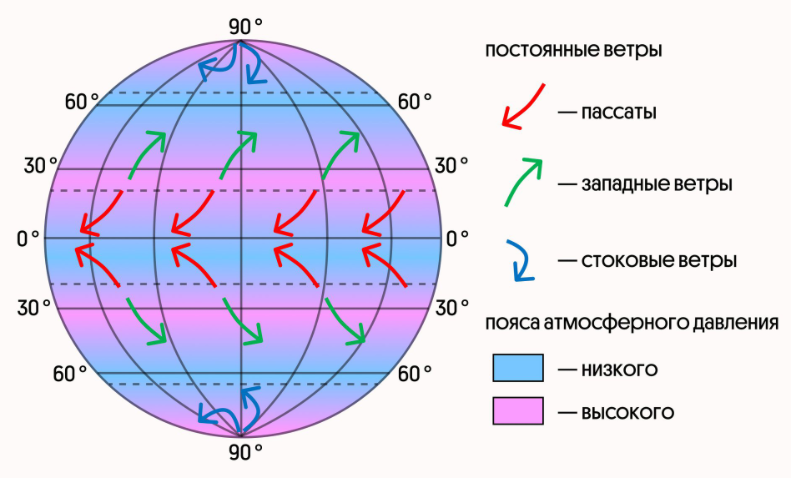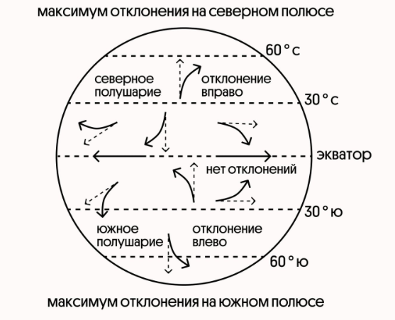 Благодаря силе Кориолиса постоянные ветры меняют своё направление: в Северном полушарии ветры отклоняются вправо, а в Южном влево.