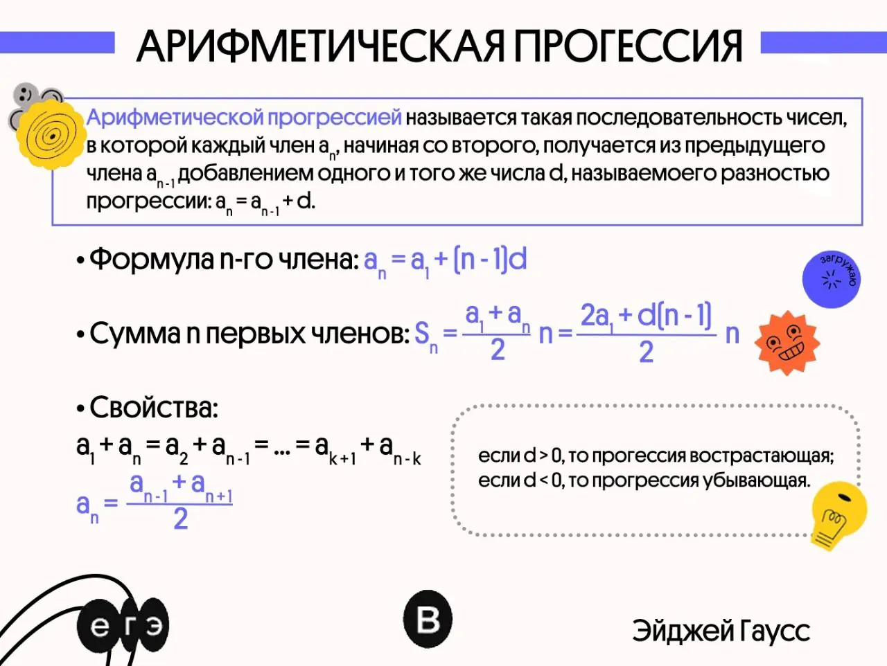 Арифметическая прогрессия — последовательность, в которой каждый следующий член можно найти, прибавив к предыдущему одно и то же число d.