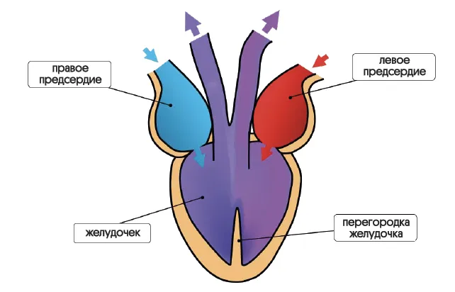 В единственном желудочке сердца появилась неполная перегородка, уменьшающая смешение артериальной и венозной крови. Это повысило эффективность снабжения тканей кислородом.