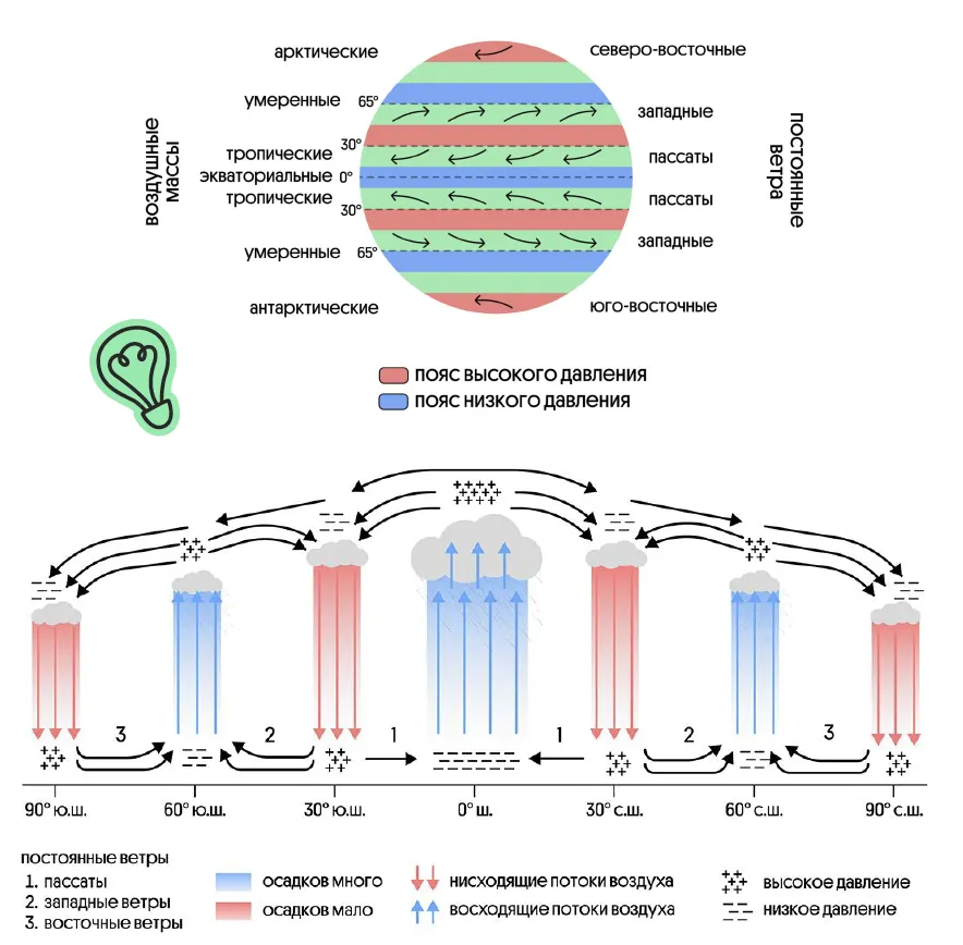 У экватора тёплый воздух поднимается, создавая пояс низкого давления. Этот воздух оттекает к тропикам, где охлаждается и опускается вниз, образуя пояс высокого давления. От тропических поясов воздух в более низком слое атмосферы поступает не только к экватору, но и в умеренные широты, где давление также ниже. В полярных областях из-за низких температур воздух более плотный и тяжёлый, что приводит к образованию второй зоны высокого давления.