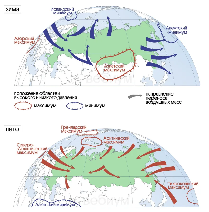 Помимо этого, летом Северное полушарие нагревается сильнее, а зимой меньше. Так, пояса давления летом смещаются к северу, а зимой — к югу.