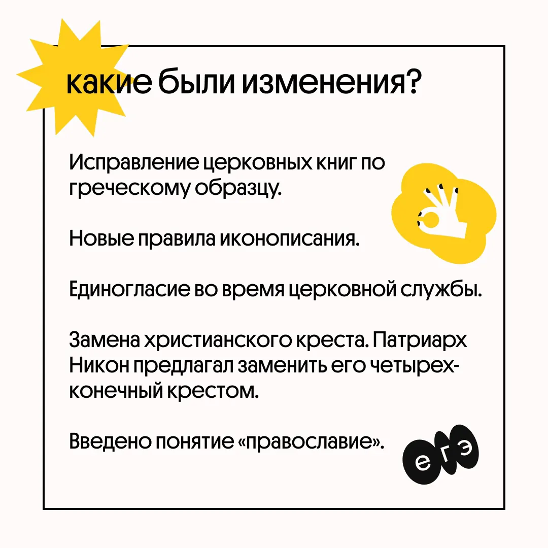 Реформы Никона в XVII веке коснулись буквально всех церковных укладов. И без знаний этой темы сдать ЕГЭ по истории будет трудновато. В этой шпаргалке мы собрали для вас ответы на важные вопросы. Что изменилось? К чему привели такие изменения?
