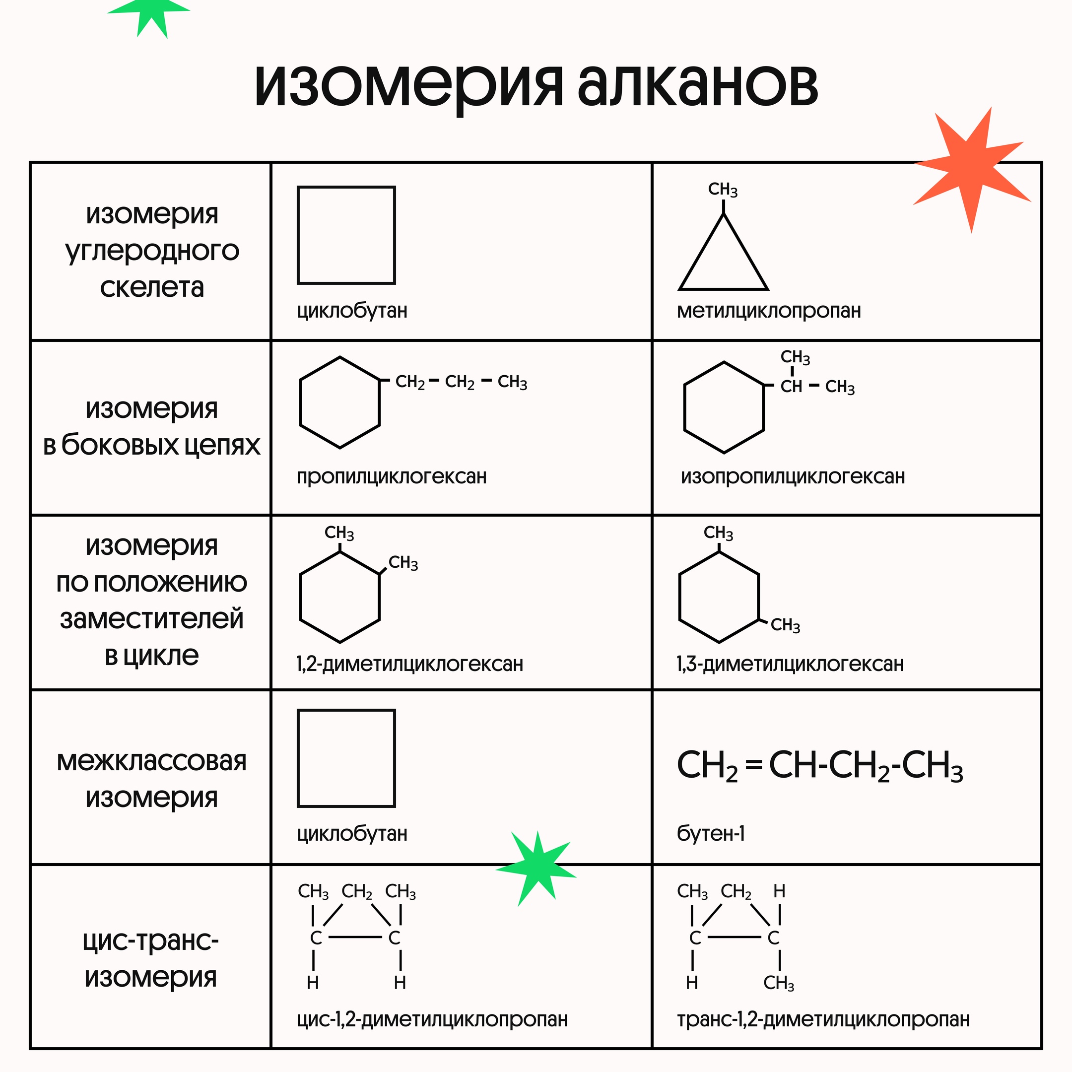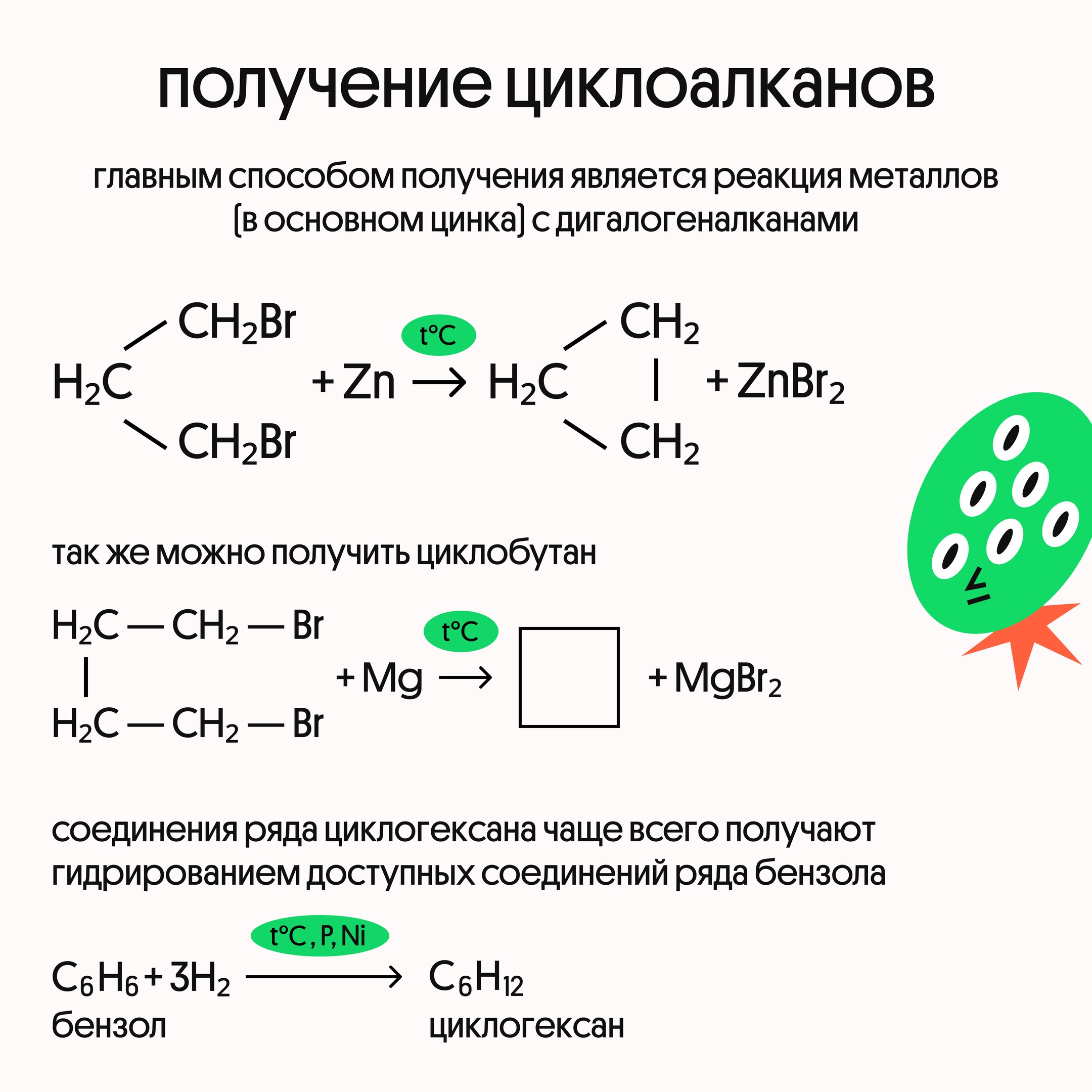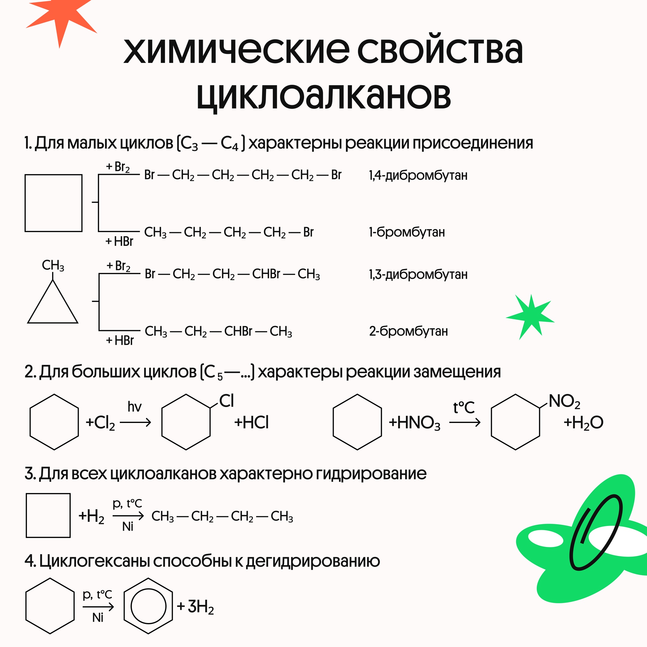 Мы подготовили полезные таблички с теорией по циклоалканам. Наибольшие трудности у ребят вызывают химические свойства — забирай к себе и обязательно повтори перед ЕГЭ по химии!