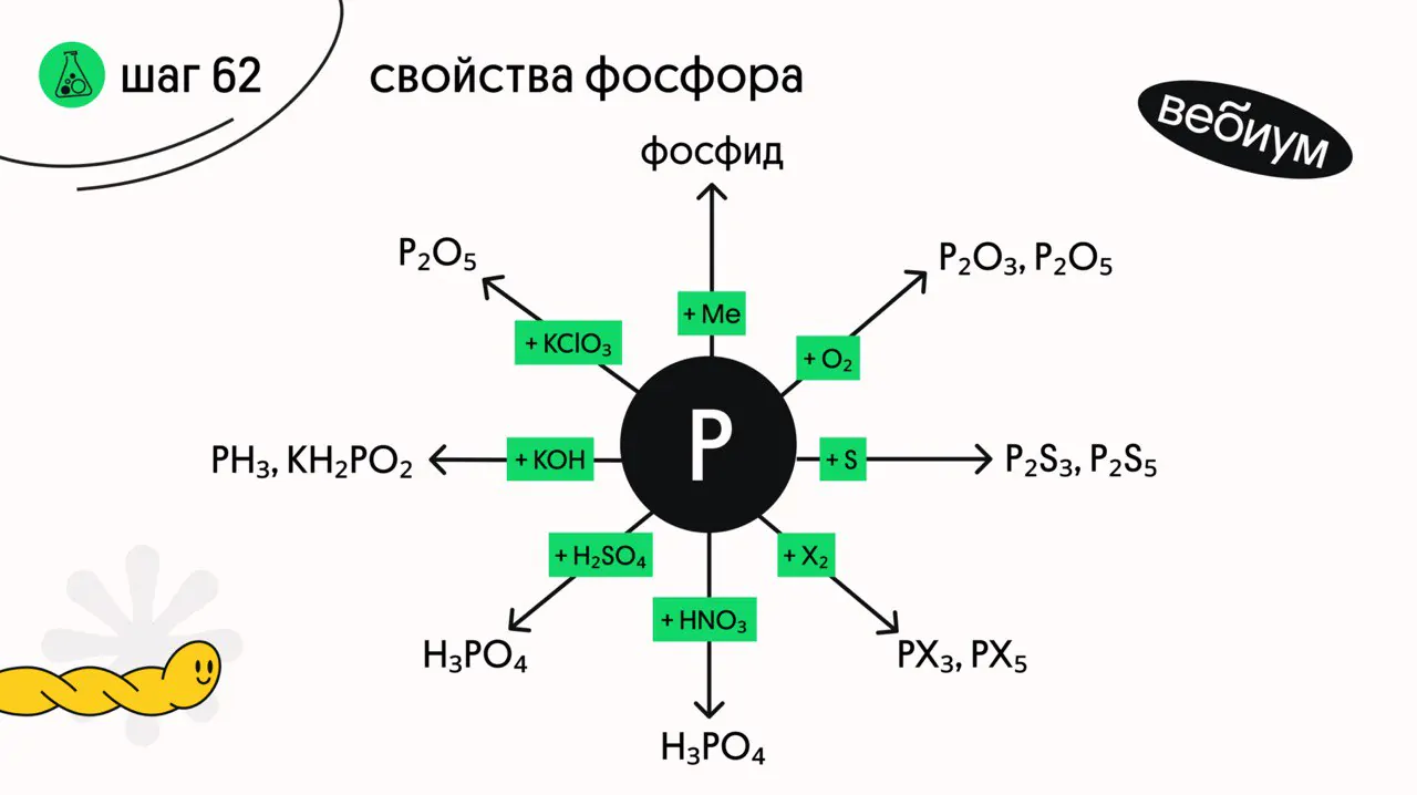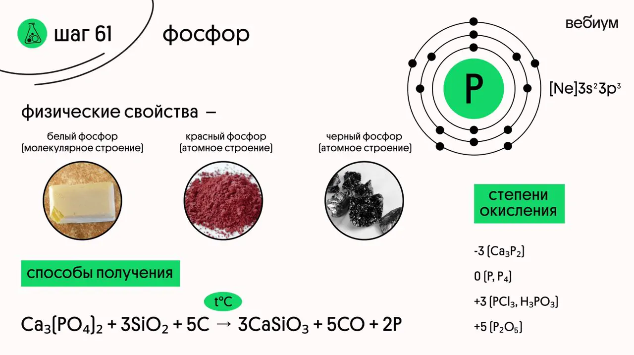 Фосфор (P) — элемент VA группы и третьего периода. У фосфора 5 внешних электронов, в соединениях он проявляет различные степени окисления: -3, +3, +5. Фосфор может иметь и другие С.О., но в школе их не изучают 👀