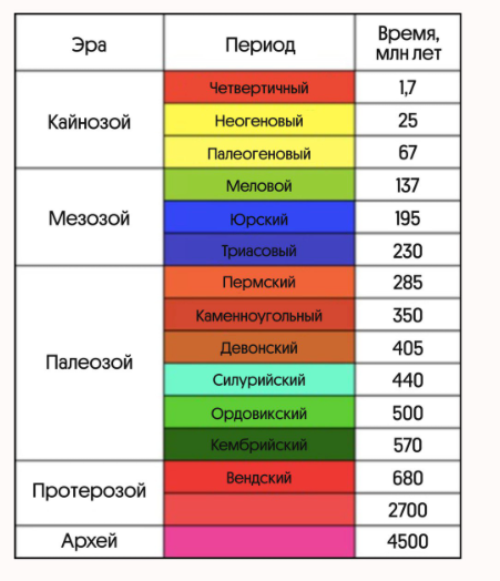 Геологическое развитие Земли поделено на эры, которые, в свою очередь, поделены на периоды. Протяжённость эр составляет сотни миллионов и даже миллиарды лет.