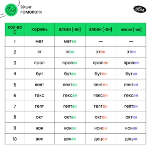«Опознать» представителей одного гомологического ряда можно даже по названию. Алканы отличаются наличием суффикса «ан», спирты — суффикса «ол» и т.д. Интересно, что корень названия зависит только от количества углеродов в цепи. Если в цепи 2 атома углерода, в названии будет корень «эт», 3 атома углерода — корень «проп» и т.д. Эти корни придётся выучить, они представлены в таблице!