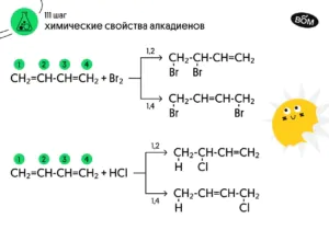 Алкадиены вступают в реакции присоединения. В зависимости от условий проведения реакции возможно 1,2-присоединение и 1,4-присоединение.
