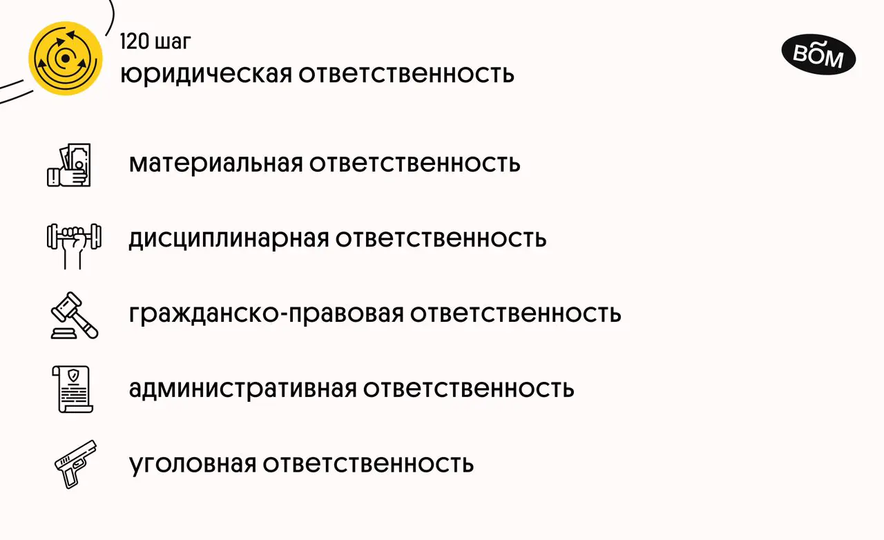 🔗 Виды наказаний: штраф, лишение права занимать определённые должности, лишение специального воинского или почетного звания и государственных аград, обязательные работы, арест, лишение свободы на опредёленный срок и др.