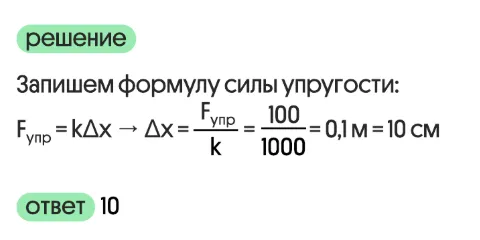 На сколько сантиметров растянется пружина, жёсткость которой k = 1000 Н/м под действием силы 100 Н? Пружину считайте идеальной.