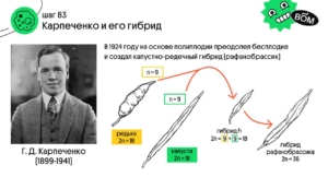 ℹ️ Карпеченко получил капустно-редечный гибрид в результате скрещивания разных растений из семейства крестоцветных. Как и многие межвидовые гибриды, он был стерилен, поскольку в каждой из клеток присутствовало по одной копии гаплоидного хромосомного набора редьки и капусты. Хромосомы редьки и капусты не вступали в конъюгацию при мейозе, в результате чего невозможно было размножение.