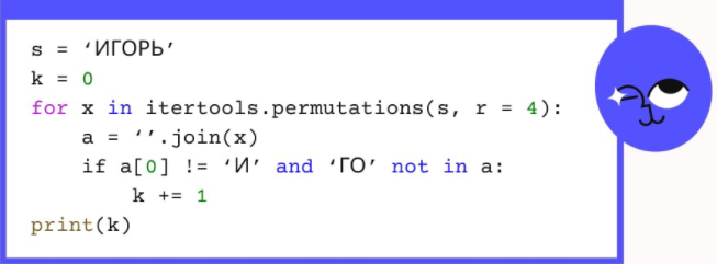 Задание: сколько четырёхбуквенных слов можно составить из букв «ИГОРЬ» при условии, что каждая буква встречается не более одного раза, слово не может начинаться с «И»
