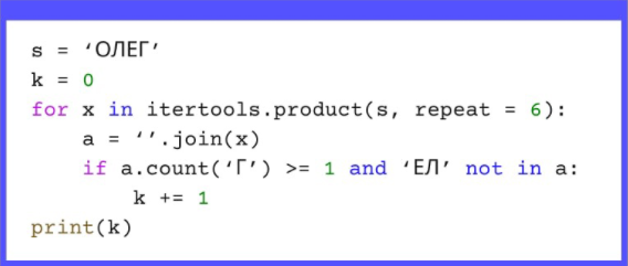 Задание: сколько существует шестибуквенных слов из букв «олег», если слово должно содержать хотя 6ы одну букву «г», каждая из оставшихся букв может использоваться любое количество раз и слово не может содержать «ел»?
