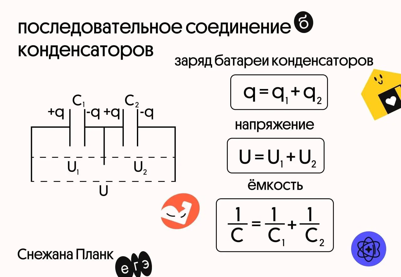 🔸 Если соединение представляет собой цепочку и к точкам включения в цепь непосредственно присоединены пластины только первого и последнего конденсатора, то это ПОСЛЕДОВАТЕЛЬНОЕ соединение.