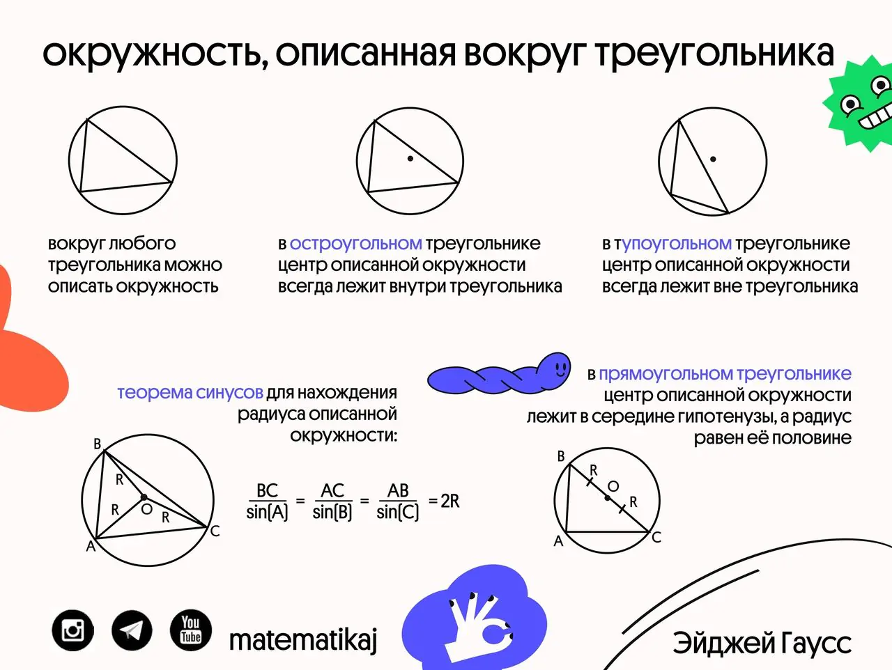 ✅ Во-первых, центр описанной окружности лежит на пересечении серединных перпендикуляров. (это свойство используется редко)