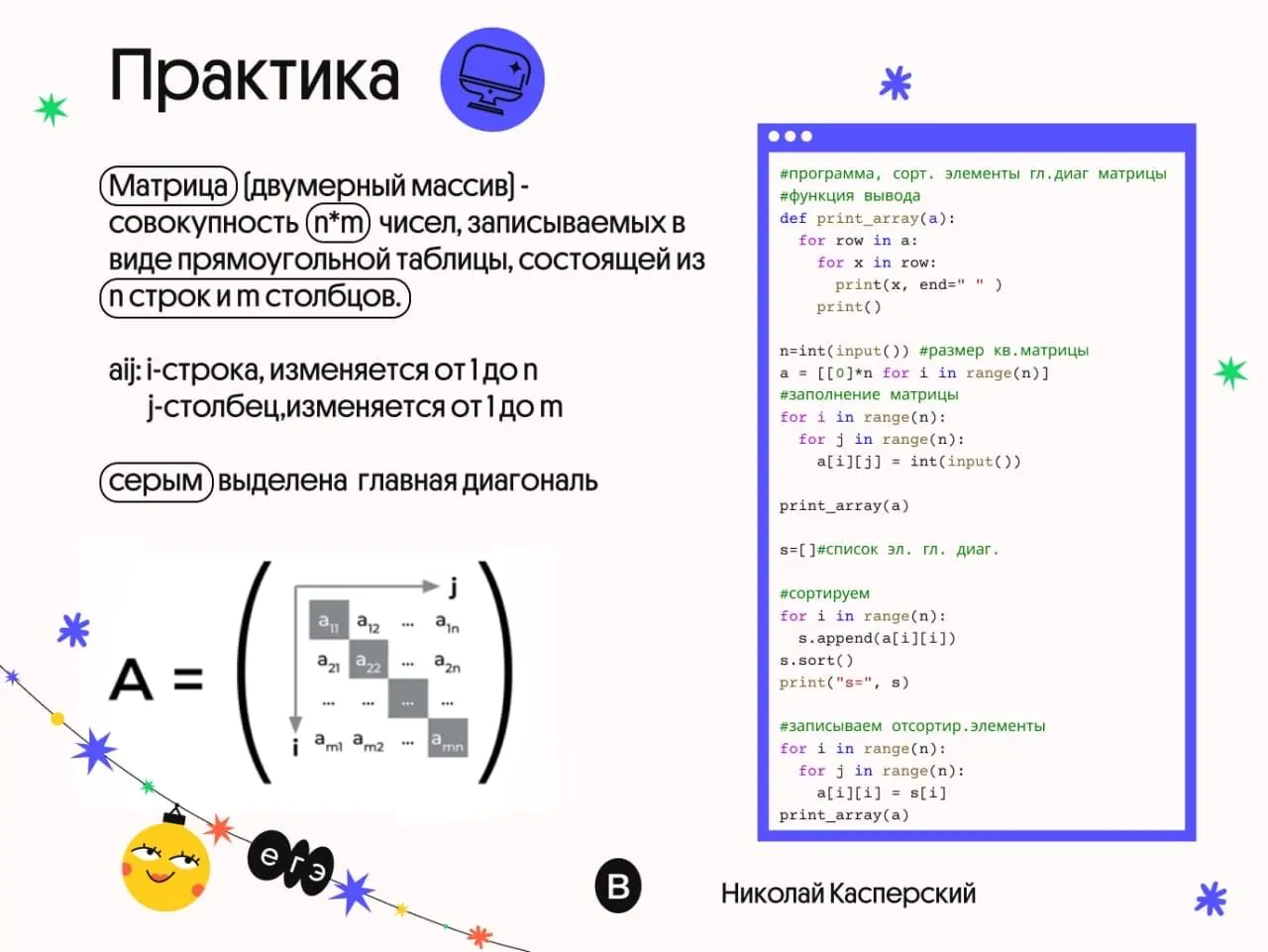 Написать программу, сортирующая элементы главной диагонали двумерного списка целых чисел.