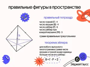 ✅ В каждой правильной фигуре, выполняется теорема Эйлера: Сумма числа вершин и числа граней на 2 единицы больше числа ребер. Максимально простая формула, которой можно смело пользоваться. Например, вспомни, что правильная фигура с четырёхугольником в грани — это куб. Посчитай, как выполняется теорема для куба👇🏻