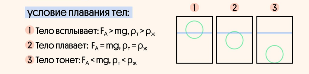 Из закона Архимеда вытекают условия плавания тел: