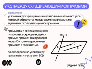 ✅ В стереометрии интереснее: кроме параллельности и пересечения прямые могут быть скрещивающимися. Скрещивающимися называются прямые, если первая из них лежит в плоскости, а другая пересекает эту плоскость в точке, не лежащей на первой прямой.