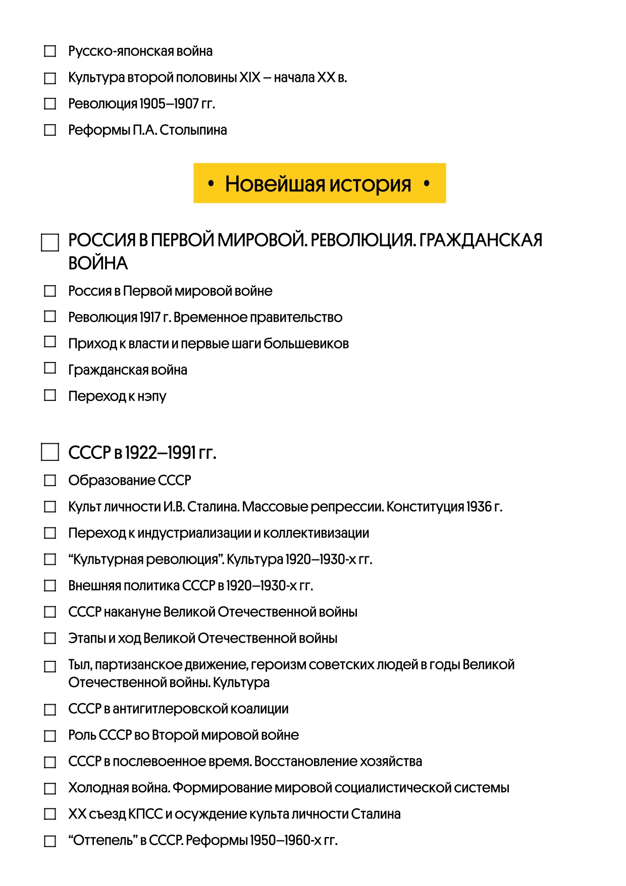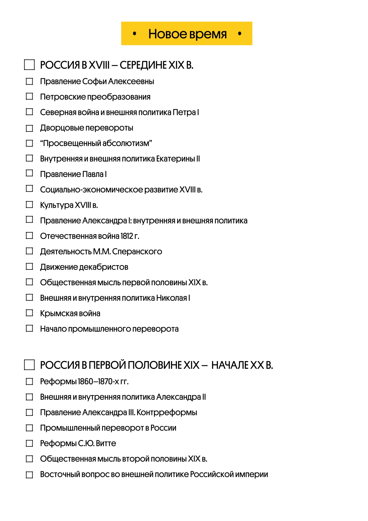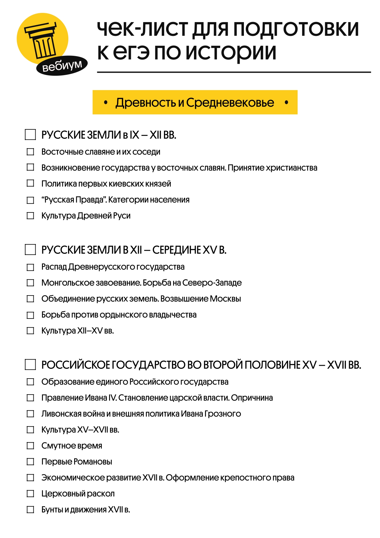 Если ты собрался сдавать ЕГЭ по истории, то без этого чек-листа тебе точно не обойтись. В нём ты сможешь фиксировать материал, который усвоил и с лёгкость отслеживать темы для изучения. Поможет тебе сдать ЕГЭ по истории на максимальный балл!