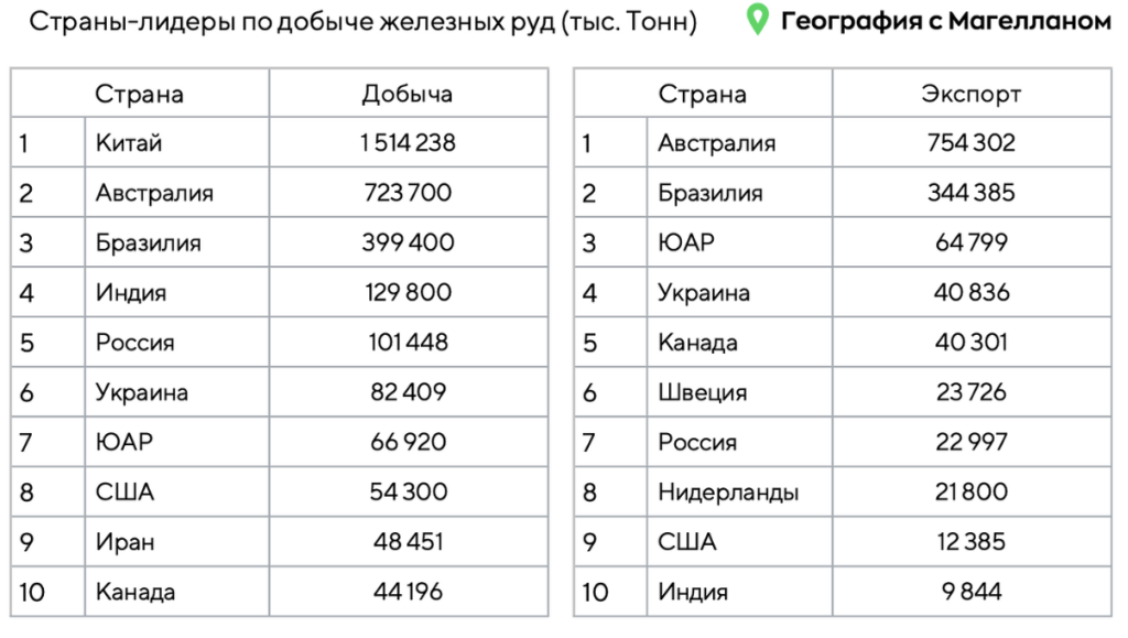 Какие три из перечисленных стран лидируют по добыче и экспорту железных руд? Запишите в ответ цифры, под которыми они указаны.