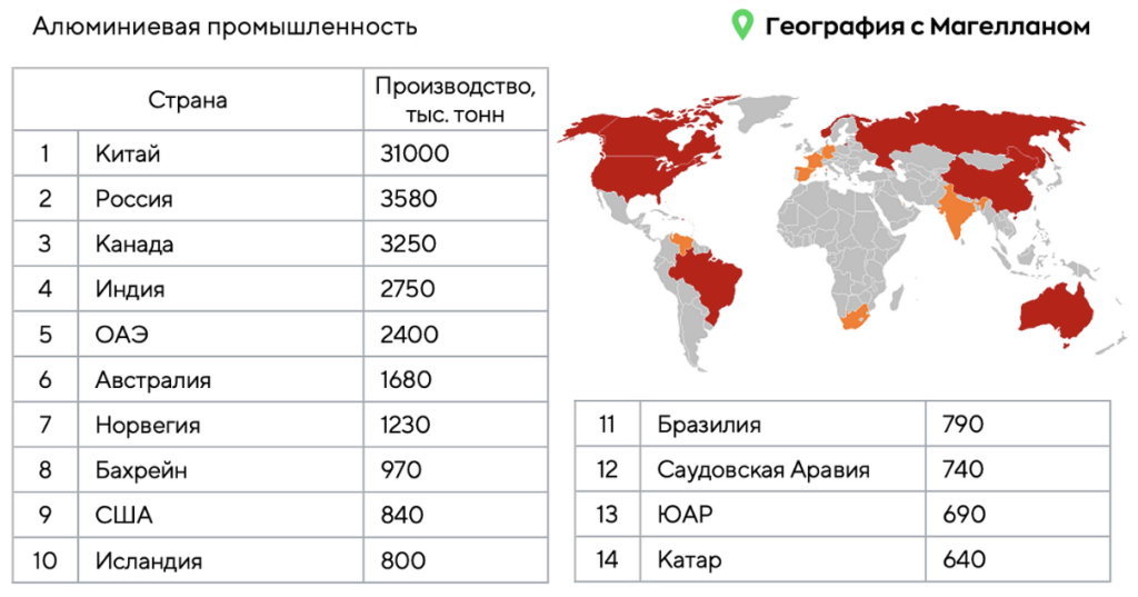 Какие три из перечисленных стран лидируют по производству металлического алюминия? Запишите в ответ цифры, под которыми они указаны.