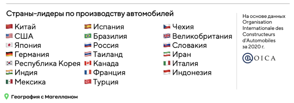 Какие три из перечисленных стран лидируют по производству автомобилей? Запишите в ответ цифры, под которыми они указаны.