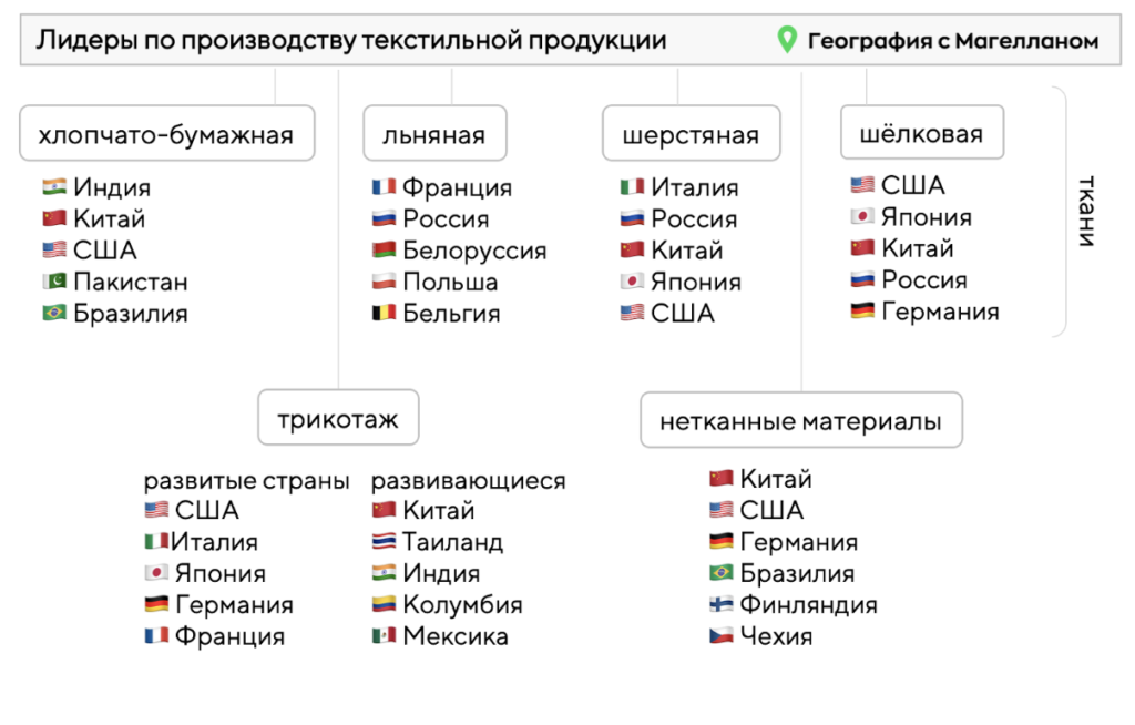 Какие три из перечисленных стран лидируют по производству хлопчато-бумажных изделий? Запишите в ответ цифры, под которыми они указаны.
