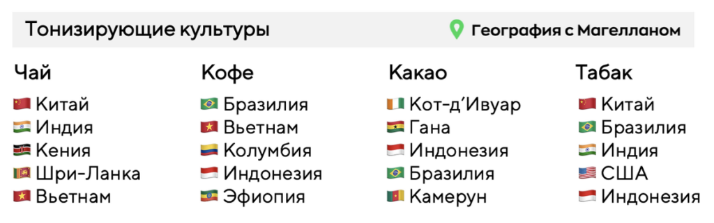 Какие три из перечисленных стран лидируют по выращиванию кофе? Запишите в ответ цифры, под которыми они указаны.