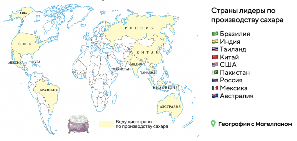 Какие три из перечисленных стран лидируют по производству сахара? Запишите в ответ цифры, под которыми они указаны.