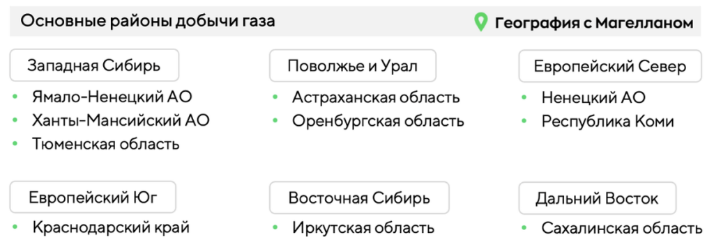 Какие три из перечисленных регионов России являются лидерами по добыче природного газа? Запишите в ответ цифры, под которыми они указаны.