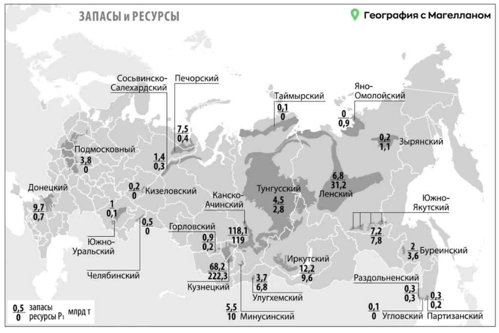 Какие три из перечисленных регионов России являются лидерами по запасам угля? Запишите в ответ цифры, под которыми они указаны.