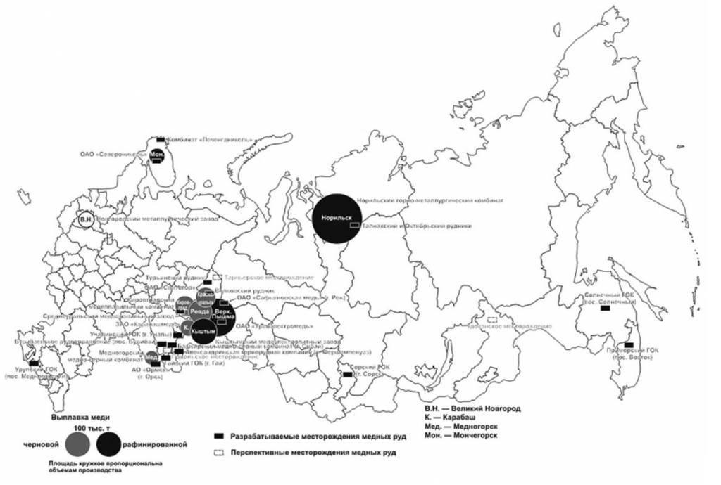 В каких трёх из перечисленных городов России работают крупные предприятия медной промышленности? Запишите в ответ цифры, под которыми они указаны.