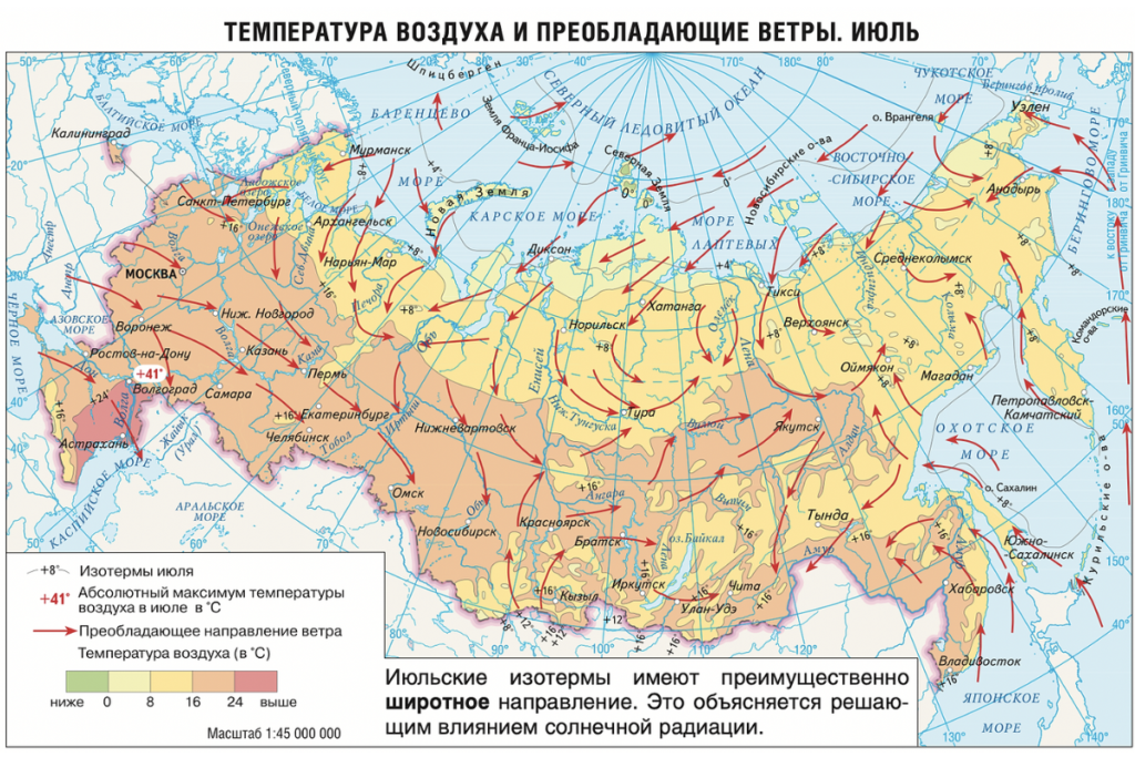 Пояснение: Июльские температуры сильно различаются и так же, как и общие температуры, зависят от радиационного баланса и особенностей поверхности территории. Изотермы июля имеют широтное простирание. Чем севернее, тем холоднее. В пунктах, расположенных вдоль одной широты, сходные средние температуры июля.