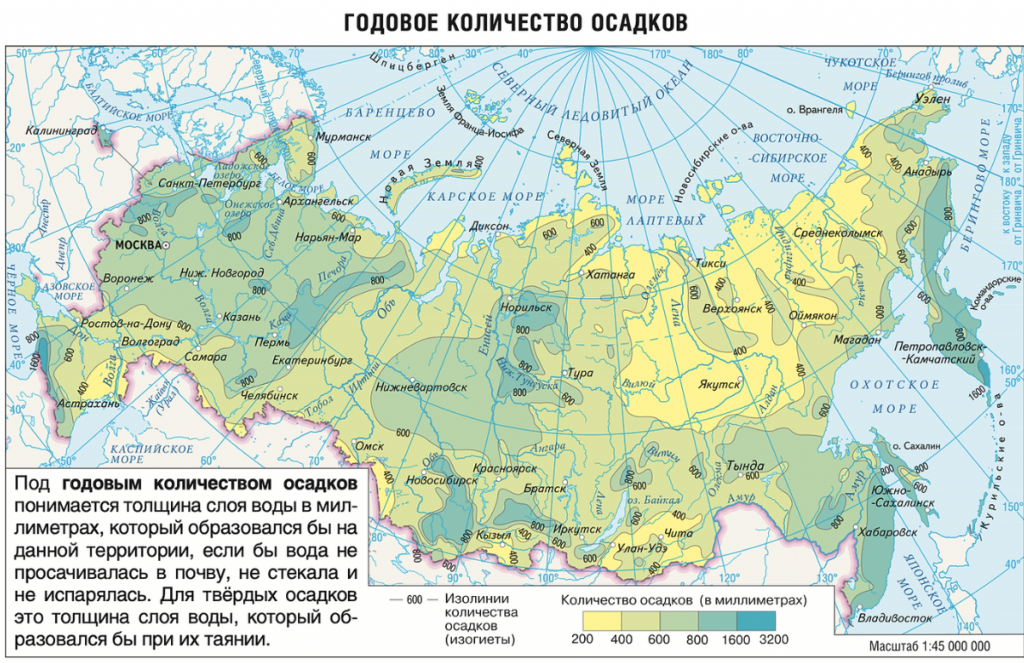 Пояснение: На распределение осадков влияют главным образом циркуляционные процессы и рельеф. Большую часть влаг на территорию России приносят циклоны Атлантического океана. Благодаря западным ветрам и отсутствию горных барьеров они проникают далеко на восток. Влажное «дыхание» Атлантики ощущается вплоть до Енисея. С запада на восток количество осадков постепенно уменьшается.